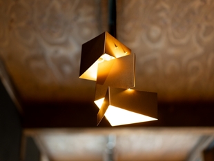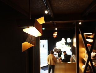 折り目をつけることで強度が出る板金の性質を利用し、薄い材でも素材として活用できるよう工夫することで環境にも優しいランプシェードとなりました。(デザイン監修:隈研吾)