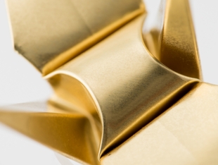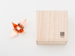 現在では、贈り物や、ホテルの内装の飾りとして使われたりしています。板金職人が一つひとつ手作りした折鶴は、銅と真鍮でできているため、経年変化によって日々移り変わる風合いを楽しむことができます。