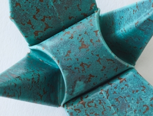現在では、贈り物や、ホテルの内装の飾りとして使われたりしています。板金職人が一つひとつ手作りした折鶴は、銅と真鍮でできているため、経年変化によって日々移り変わる風合いを楽しむことができます。